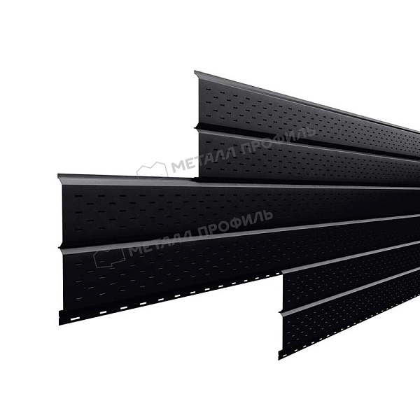 Софит – это панели сайдинга Lбрус, на поверхности которых нанесены мелкие отверстия. Применяется для подшивки кровельных свесов. Софит МЕТАЛЛ ПРОФИЛЬ Lбрус-15х240 (VikingMP E-20-9005-0.5)подчёркивает законченный и эстетичный вид здания. Отверстия в панелях поддерживают доступ воздуха в подкровельное пространство и предохраняют от появления конденсата, грибка, плесени.Покрытие VikingMP® E: